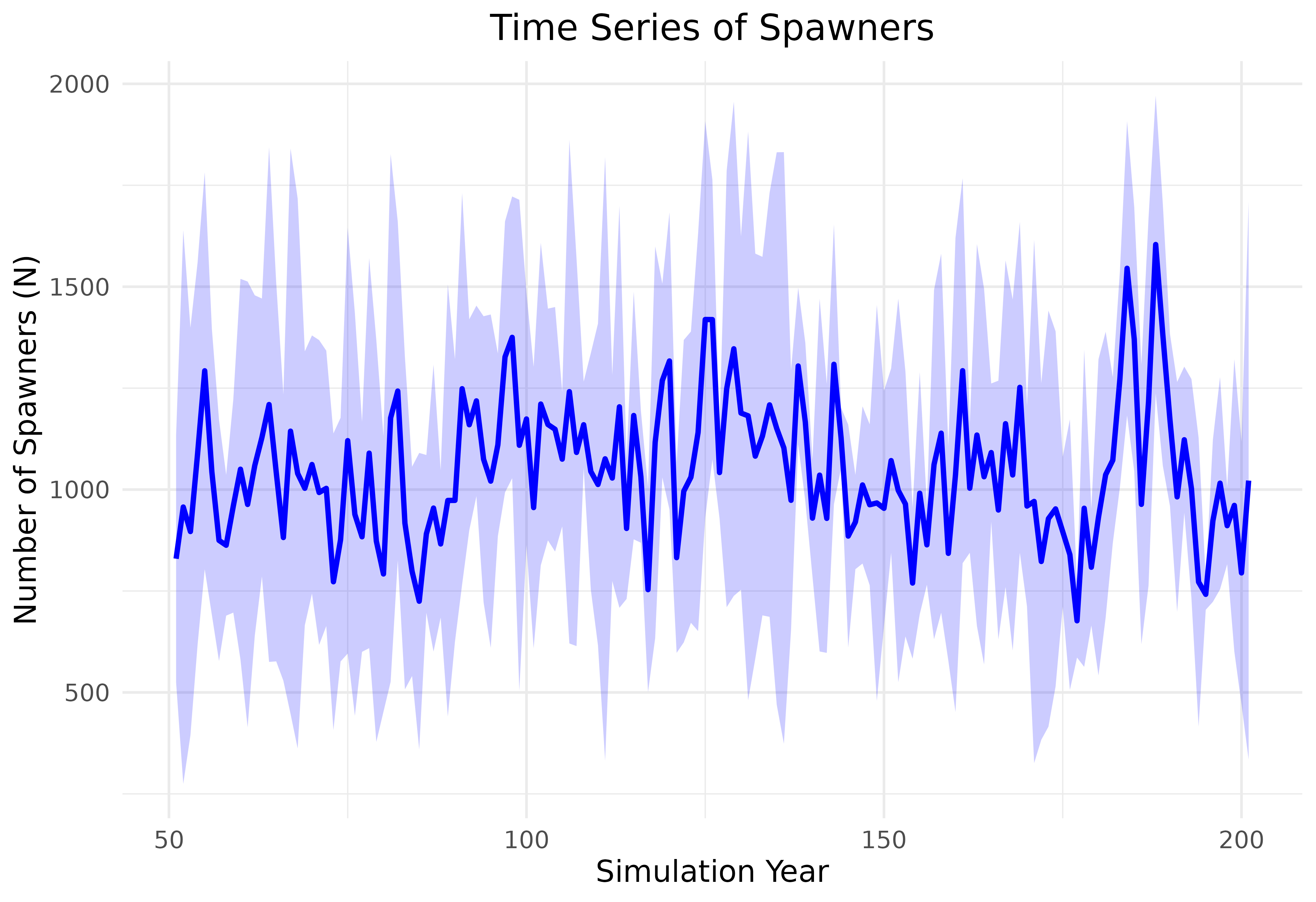 labs(title = "Time Series of Spawners", x = "Simulation Year", y = "Number of Spawners (N)") +